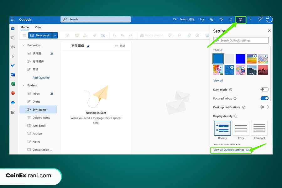در گوشه سمت راست بالا روی [تنظیمات] کلیک کنید و برای ورود به رابط تنظیمات، روی [مشاهده همه تنظیمات Outlook] کلیک کنید.