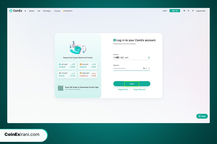 ابتدا به وبسایت رسمی کوینکس (https://www.coinex.com) مراجعه کنید. در گوشه سمت راست بالای صفحه، گزینه “ورود” را پیدا کرده و روی آن کلیک کنید. با انجام این کار، صفحه ورود به حساب کاربری برای شما باز خواهد شد. در این صفحه، شما میتوانید با استفاده از ایمیل یا نام کاربری و رمز عبور خود وارد حساب کاربریتان شوید.